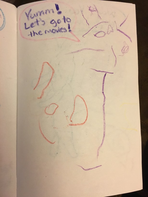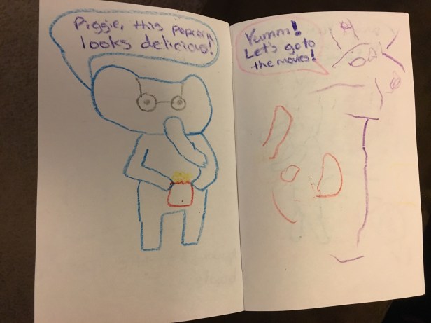 We are both big fans of the “Elephant & Piggie” series by Mo Willems, so it was a natural choice for us when thinking about what our story would be about…we could create our own “Elephant & Piggie” adventure! I asked my son what he wanted our story to be about. His first suggestion was already an “Elephant & Piggie” book. So he thought longer and quickly came up with an original idea that sounded great…Elephant and Piggie were going to go to a “popcorn show”!