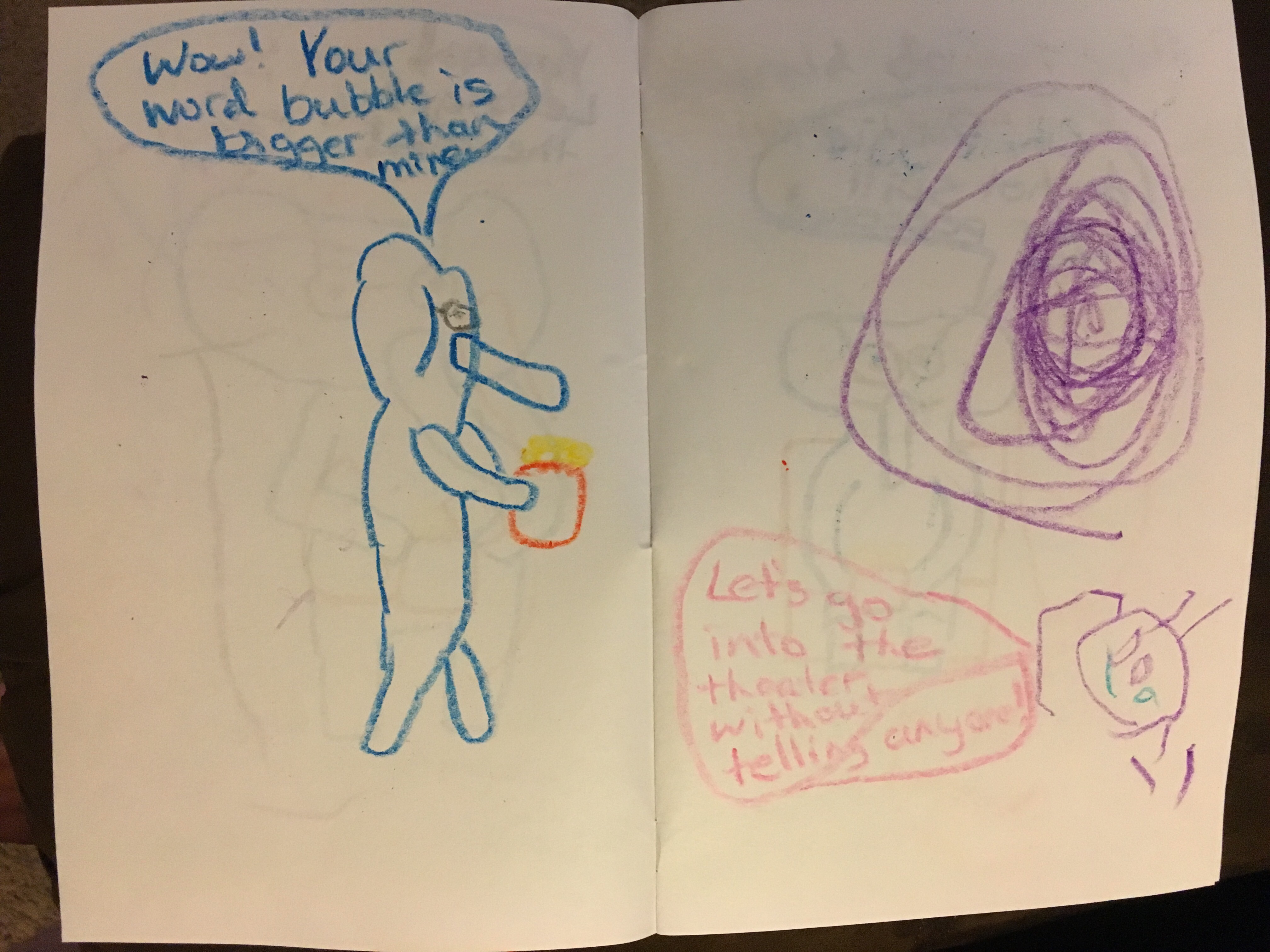 Typically when we read the “Elephant & Piggie” books he will “read” the parts for Piggie and I read the parts for Elephant Gerald. So naturally, this is how our story went as well with him drawing and giving words to Piggie and me responsible for Gerald. We took turns and had lots of fun coming up with the ideas for each page. I was very impressed with his ability to understand the natural flow of a story. He remembered what we had written on the previous page and picked the next step that the story would follow. He understood that the characters needed to interact with each other and helped me come up with what my character would say in response to his character and vice versa.