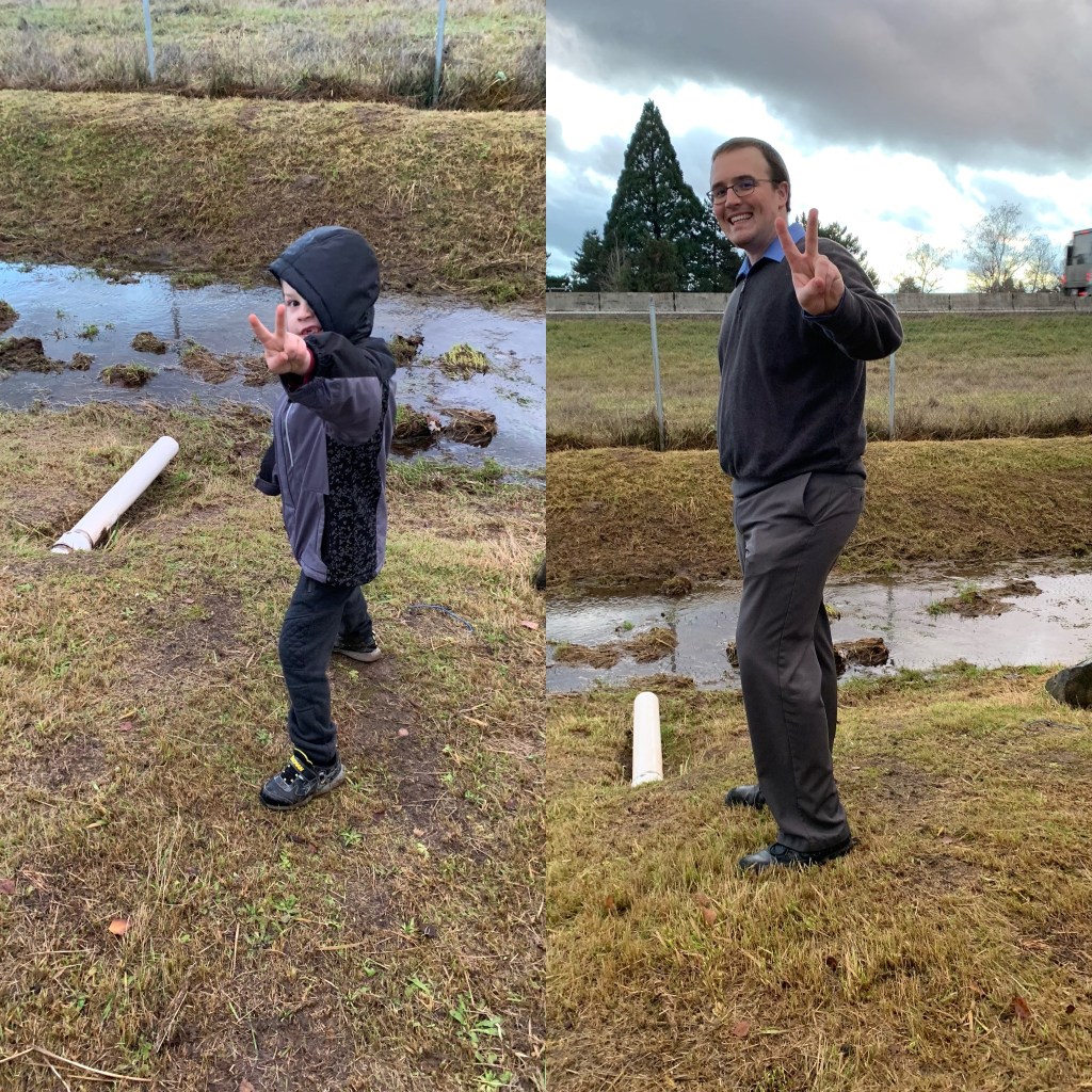 We had fun on our adventure! We were adventuring by a little stream in a neighborhood by school. We went by the white pipe at the end of a little stream. We had fun following the stream. We went a long time. It was super-duper fun! We also could see the freeway. In front of the freeway was a fence that I could climb, but I didn’t. And we took pictures of me and Dad…