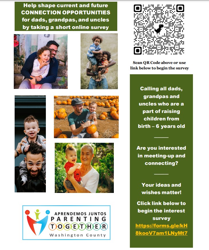Hey dads and male caregivers in Washington County…are you interested in opportunities to be a part of a group of guys focused on being the best for our kids? Please check out the flyer below and scan and take the survey in the QR code to help us make sure we are providing a group that meets your needs. Thank you to my friends at Parenting Together Washington County for making this dream a reality!