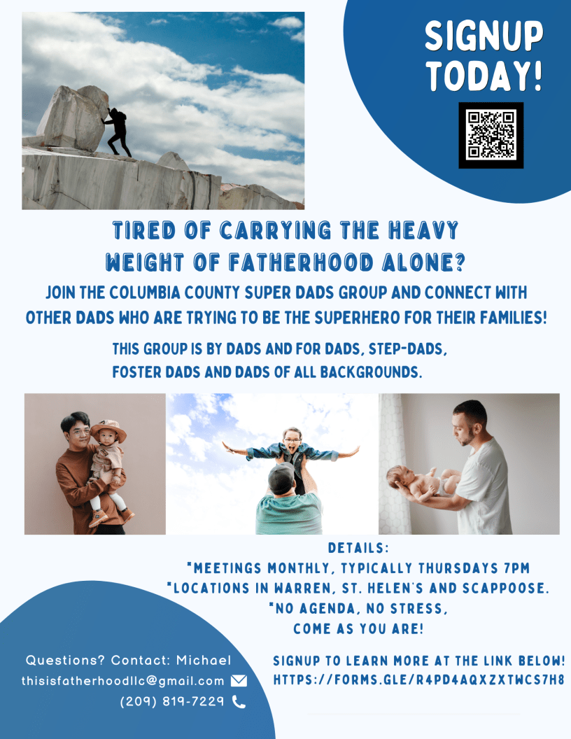 Thus the Columbia County Super Dads Group was born! We’re still in the building stage but we are really excited to bring this to the community and invite you to join us. We’re just a bunch of regular guys, regular Dads, with no agenda except for encouraging each other and sharing the highs and lows of fatherhood. If you are interested in joining us, please reach out to me or make sure to follow the registration link here or in the flyer below. We are also continuing to offer virtual Becoming A Super Dad Workshops throughout the fall and you can see that flyer below as well.